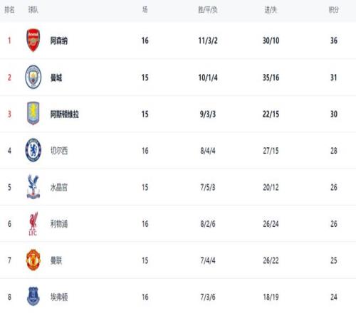 在积分榜上,阿森纳以36分继续领跑。曼城少赛一场,以31分排名第2。第3的是阿斯顿维拉,拿到30分。切尔西赢球之后,暂时杀入了欧冠区,28分排名第4。水晶宫和利物浦都是26分,排名第5和第6。曼联以25分排名第7。第8的是埃弗顿,拿到24分。热刺和纽卡斯尔联只拿到22分,排名第11和第12。